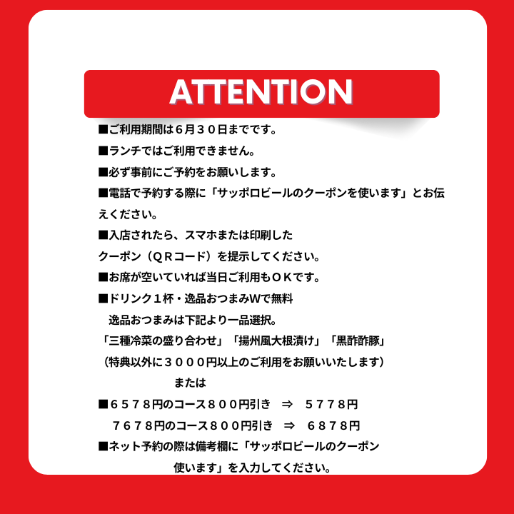 6月30日まで ドリンク1杯+逸品おつまみがWで無料!または特定コースより800円引き